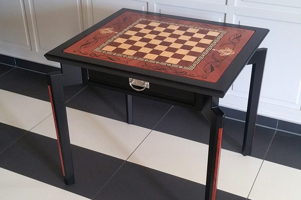 Wir bieten Ihnen einen von uns entworfenen einzigartigen, mit höchster handwerklicher Präzession gefertigten Schachtisch mit Jugendstil-Elementen und zugehöriger Figuren zum Kauf an. Um die Einzigartigkeit klar herauszustellen haben wir ganz bewusst auf eine Kopie nach musealer Vorlage verzichtet. Die Fertigung des Intarsien-Dekors aus wertvollen Edelhölzern erfolgt in einer limitierten Auflage von 50 Stück mit Zertifizierungsurkunde, sodass Ihre Anlage von beständigem Wert bleiben wird.