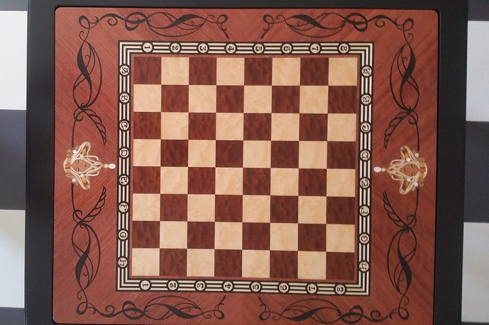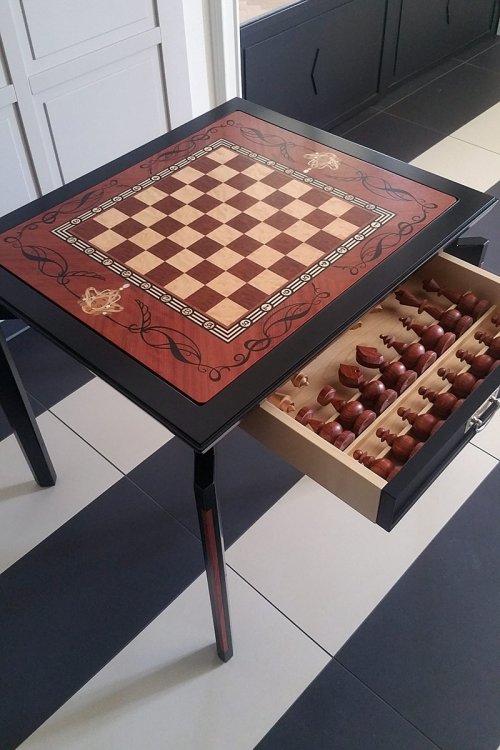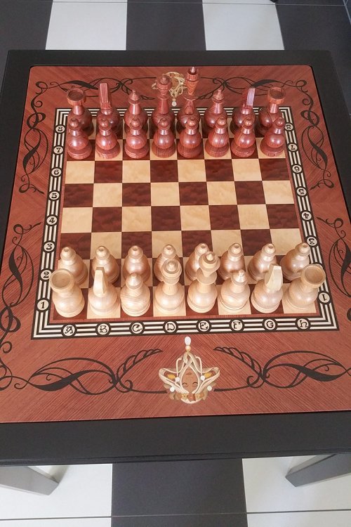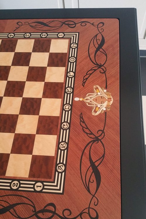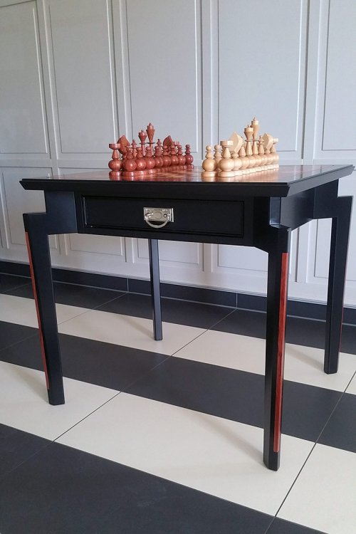 Unser Schachtisch mit Stilelementen des Jugendstils in höchster Qualität haben wir mit viel Liebe entworfen und mit handwerklichem Können umgesetzt; mit feinsten Intarsien ausgestattet und den Anforderungen an Turniere entsprechend. Die zugehörigen Schachfiguren sind selbstverständlich ebenso einzigartig. Als Limitierte Auflage bieten wir ihn nun zum Verkauf.