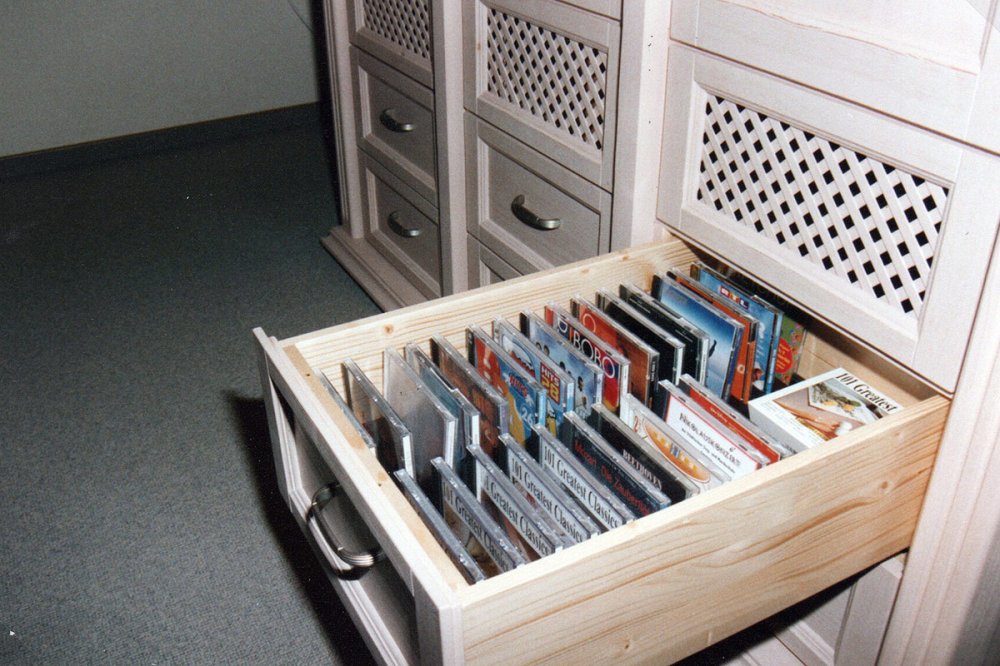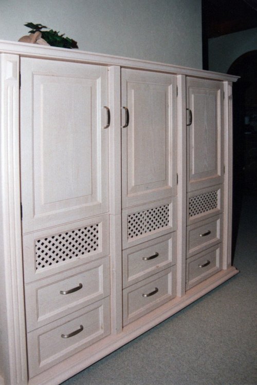 Für einen unserer Kunden fertigten wir einen Medienschrank im italienischen Landhaus-Stil. Hierin verstecken sich alle Medien und Geräte, die ansonsten offen im Raum stünden. Zur Anwendung kam hier lasiertes Pinien-Holz.